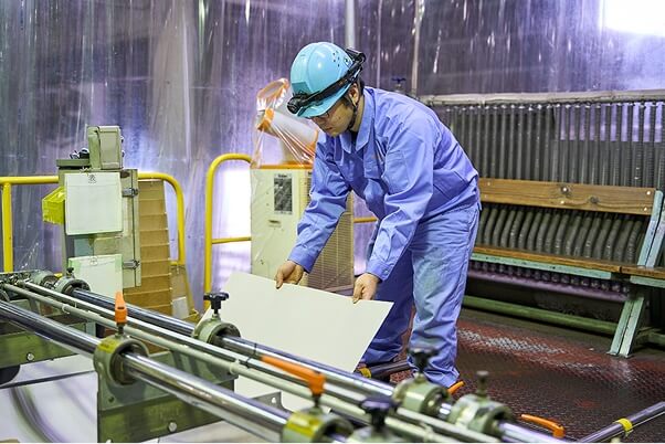 抄替後は製品の厚み・水分率・米坪など品質基準を満たしているか測定作業で確認してから製品とします。