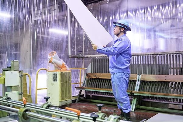 平板にカットする製造方法から、ロール状に巻き取る製造方法へ切替えします。