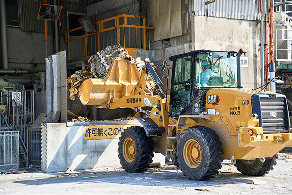 機器運転時間に合わせて、原料の仕込みを開始します。ホイールローダーにて原料を掬いパルパーへ投入します。