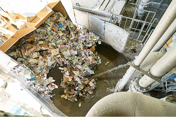 古紙と水をパルパーと呼ばれる機器に投入し、どろどろに溶かし繊維状にします。
