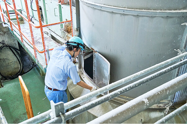 原料投入時に散らばった原料を集め掃除し、1部勤務の班へ引継ぎ、連絡事項を行います。