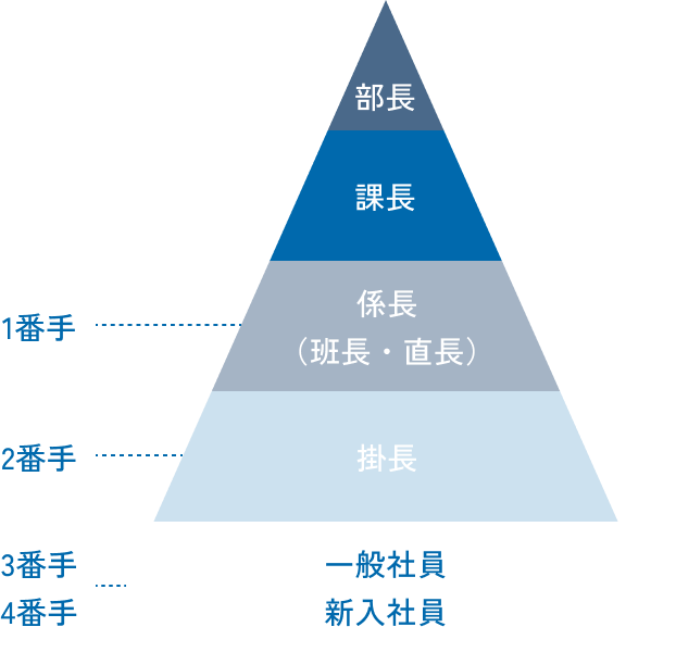 現場では、作業チームを構成するため、職位等級を定めており、現場の責任者は課長、作業は係長を中心に行い、役職手当は掛長まで支給されます。