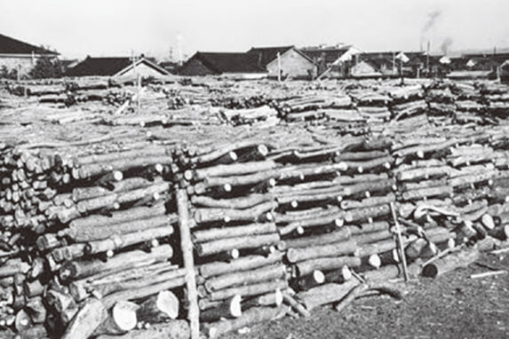 工場内にうず高く積まれた砕木パルプ用の木材。