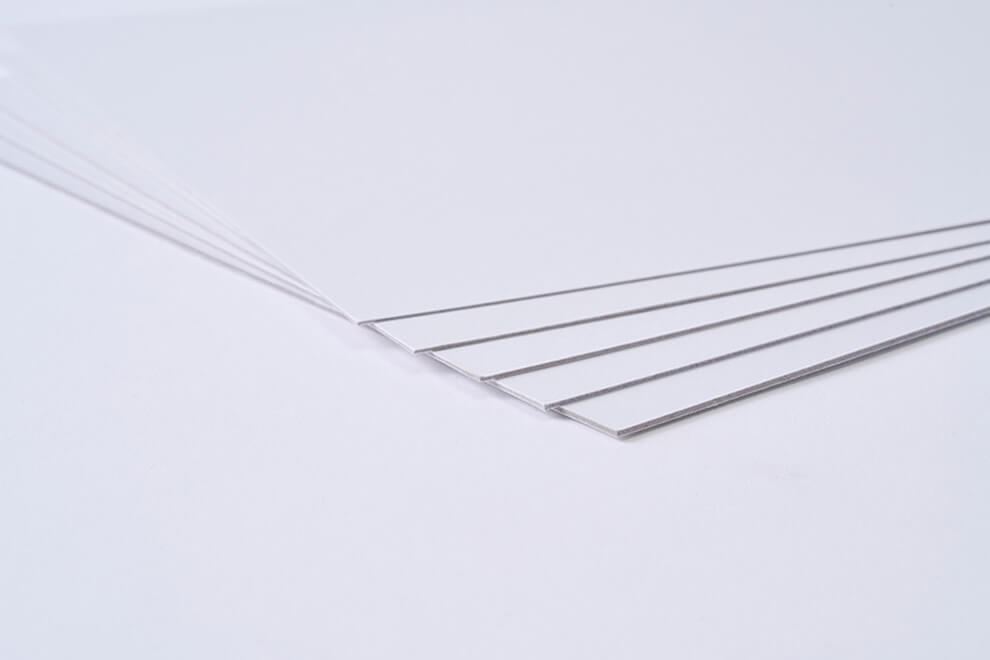 両面が美しい白色のため、洋紙や特殊紙を貼り合わせても中のねずみ色が透けて見えることがありません。高級貼箱や特殊な台紙製作に理想的な板紙です。