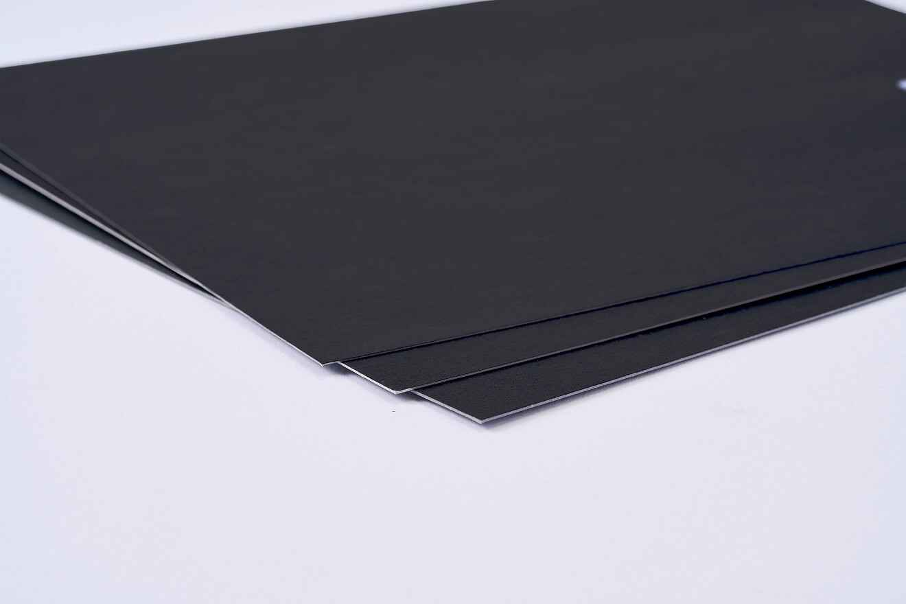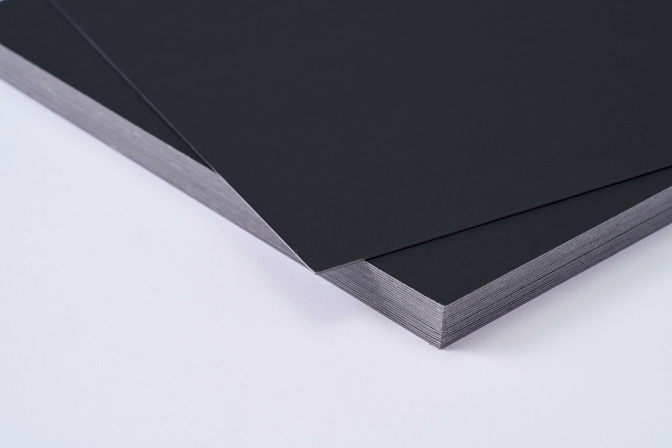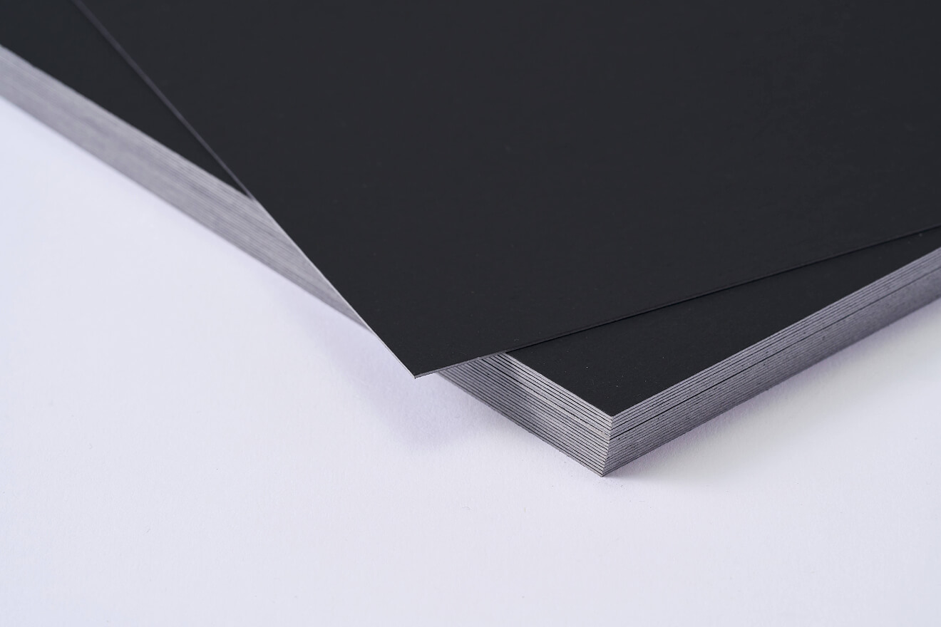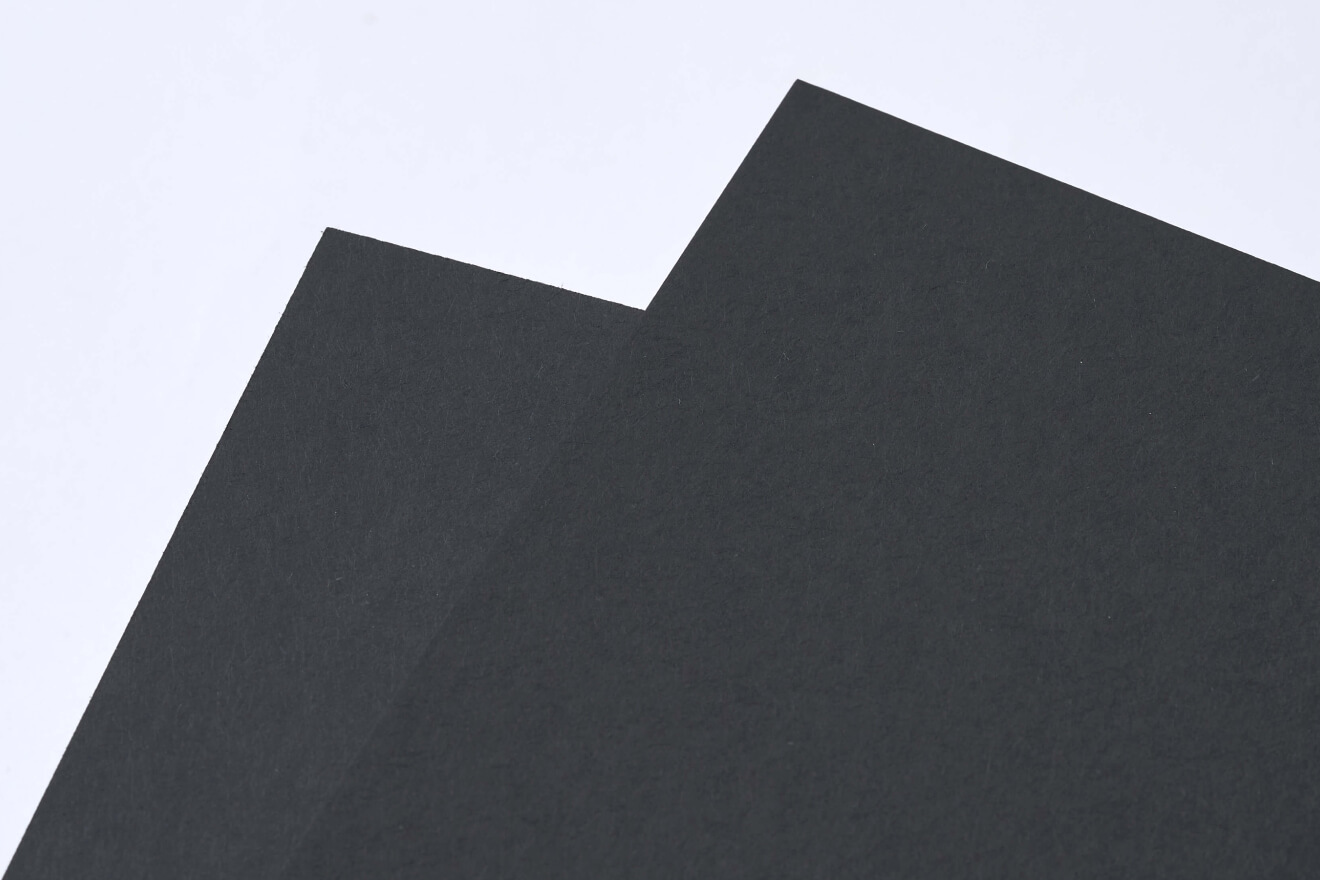 深みのある黒色を両面に持つ板紙で、KGブラックの両面黒色タイプです。