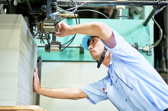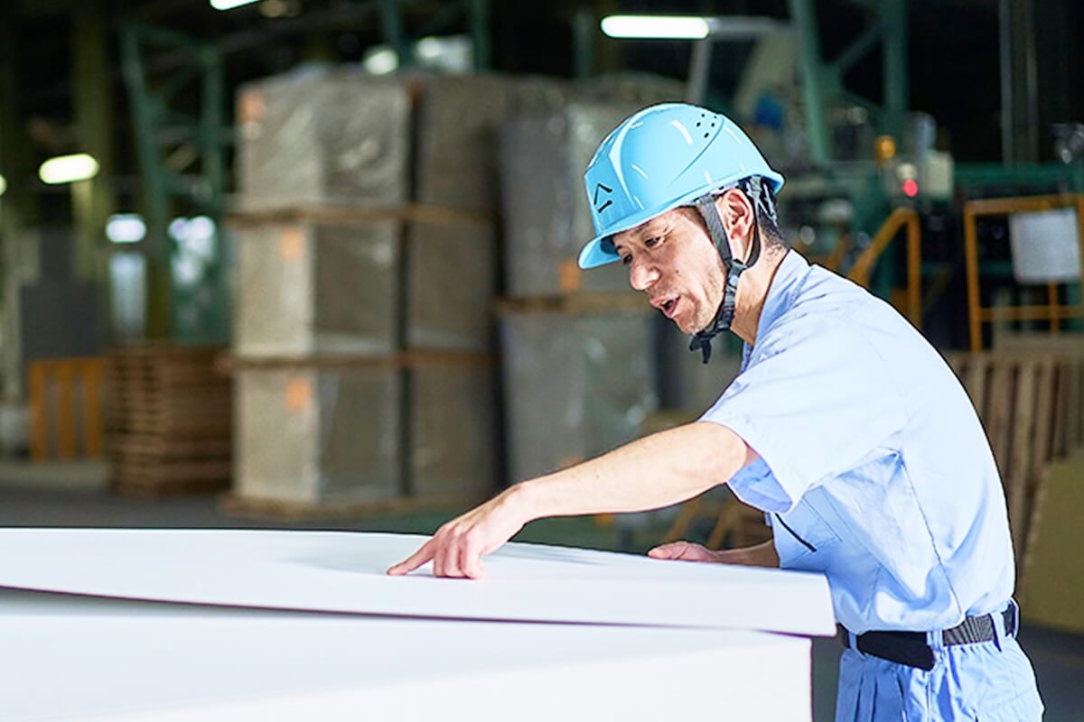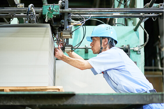- 抄紙部で仕上がった製品を糊付けし、貼り合わせてお客様注文の厚さにしたり、機械で注文寸法に断裁する加工作業をしています。