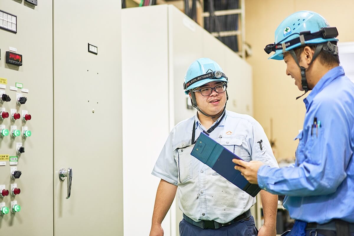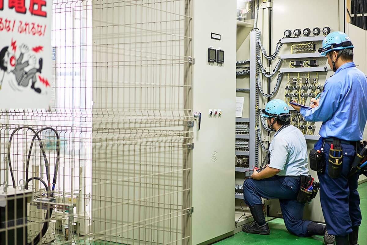 - 工場内全ての電気設備の保守点検が主で、設備の更新や設置などで電源の準備、接続などを行っています。