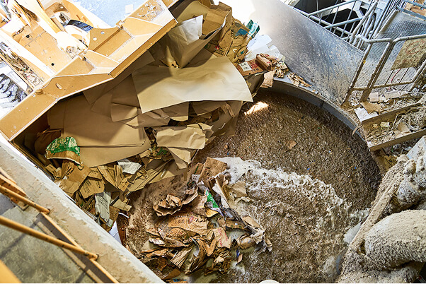 古紙と水をパルパーと呼ばれる機器に投入し、どろどろに溶かし繊維状にします。